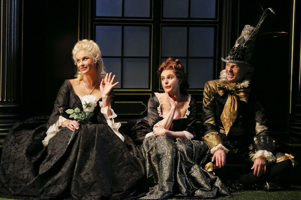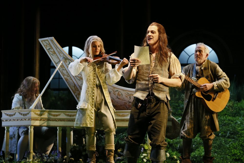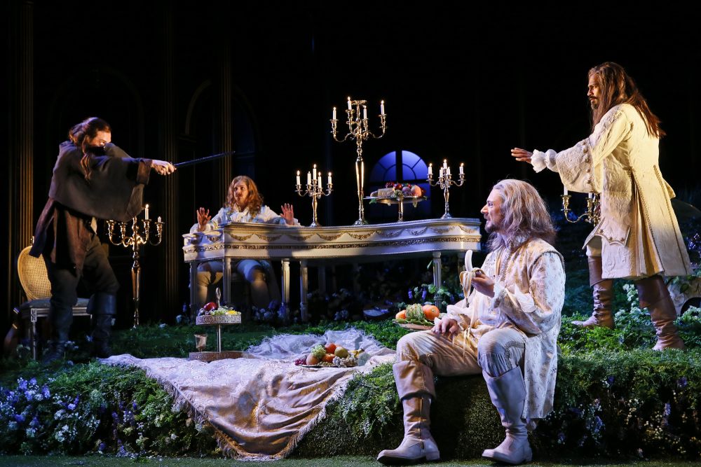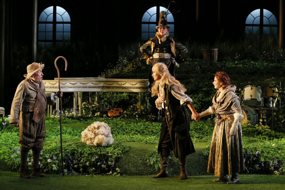 What is then revealed is an elaborate garden, green and luscious and a band of players dressed in white in a glorious display of beauty. Contrasting the natural beauty of the forest is an over-the-top sparkling white piano embellished with gold and covered in enough candelabras to make Lumiere jealous, the production picks up pace as the lovers are mismatched in moments of hilarity and farce.
