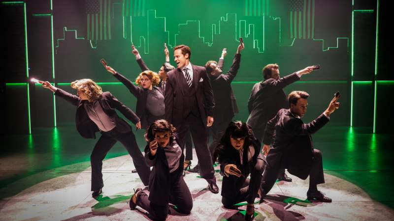 The show darts from the wedding hall to Robbie's basement bedroom to a shopping mall to a bank full of corporate suits to Las Vegas – at breakneck pace, with appropriate amounts of ballads and slapstick. Sliding panels trimmed with blue, pink and sparkly light strips keep it feeling very bright. Shoulder pads, big hair, rock t-shirts and blatant 80s references (remember Mr. Belvedere?) pepper everything.