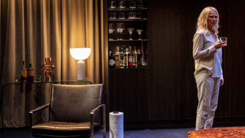 David Fleischer’s set is stylish and functional, serving as both a set within a set as well as other locations, augmented by Nick Schlieper’s coruscating lighting, illuminating both physical set and mind set.