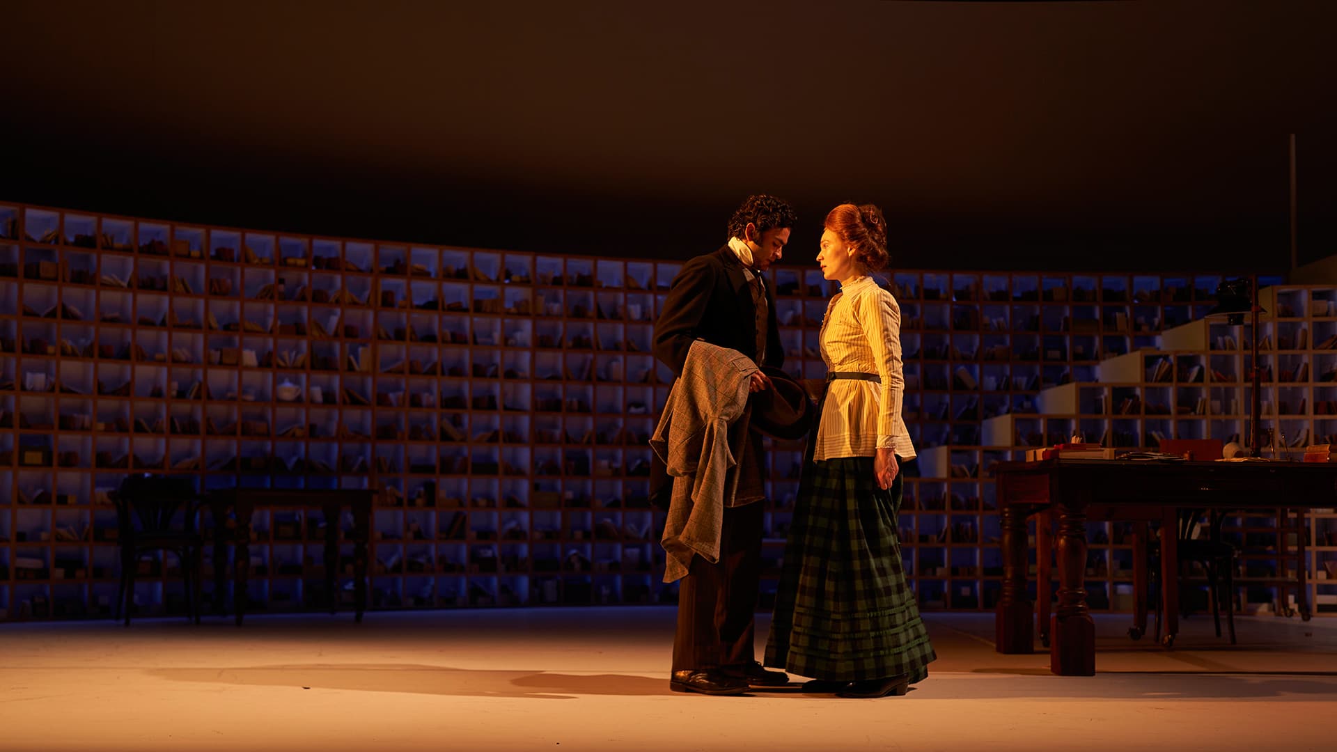 The set by Jonanthon Oxlade is both ingenious and a perfect setting for most of the action. An enormous array of literally hundreds of filled pigeonholes doubles as a staircase to the upper acting area. Here there is also a full stage-width screen for protection of explanatory dates, words, and illustrations of what is happening in the action. Furthermore, the pigeonholes are sometimes back-lit, and sometimes opening as doors.