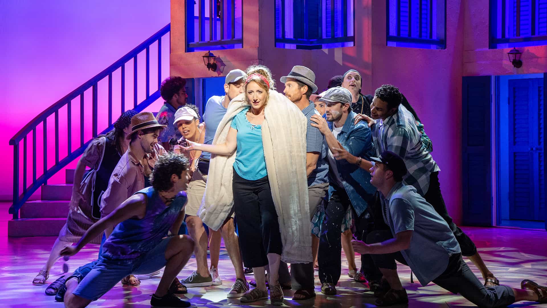 The general cast all have a great time with bouncy, snorkel-accented dancing in Lay All Your Love on Me and the busy nightmare sequence of Under Attack which spirals into slightly spooky territory with large swirling groups of ensemble dancing. As tourists, wedding guests and tavern staff in brightly printed beach wear and the occasional mermaid tail, they punctuate and enliven the two-level set. Like everything in Mamma Mia!, the set too is broad and versatile, hiding away the ever-important musicians in the shapeshifting, multi-level patio/hotel room/beach front restaurant.