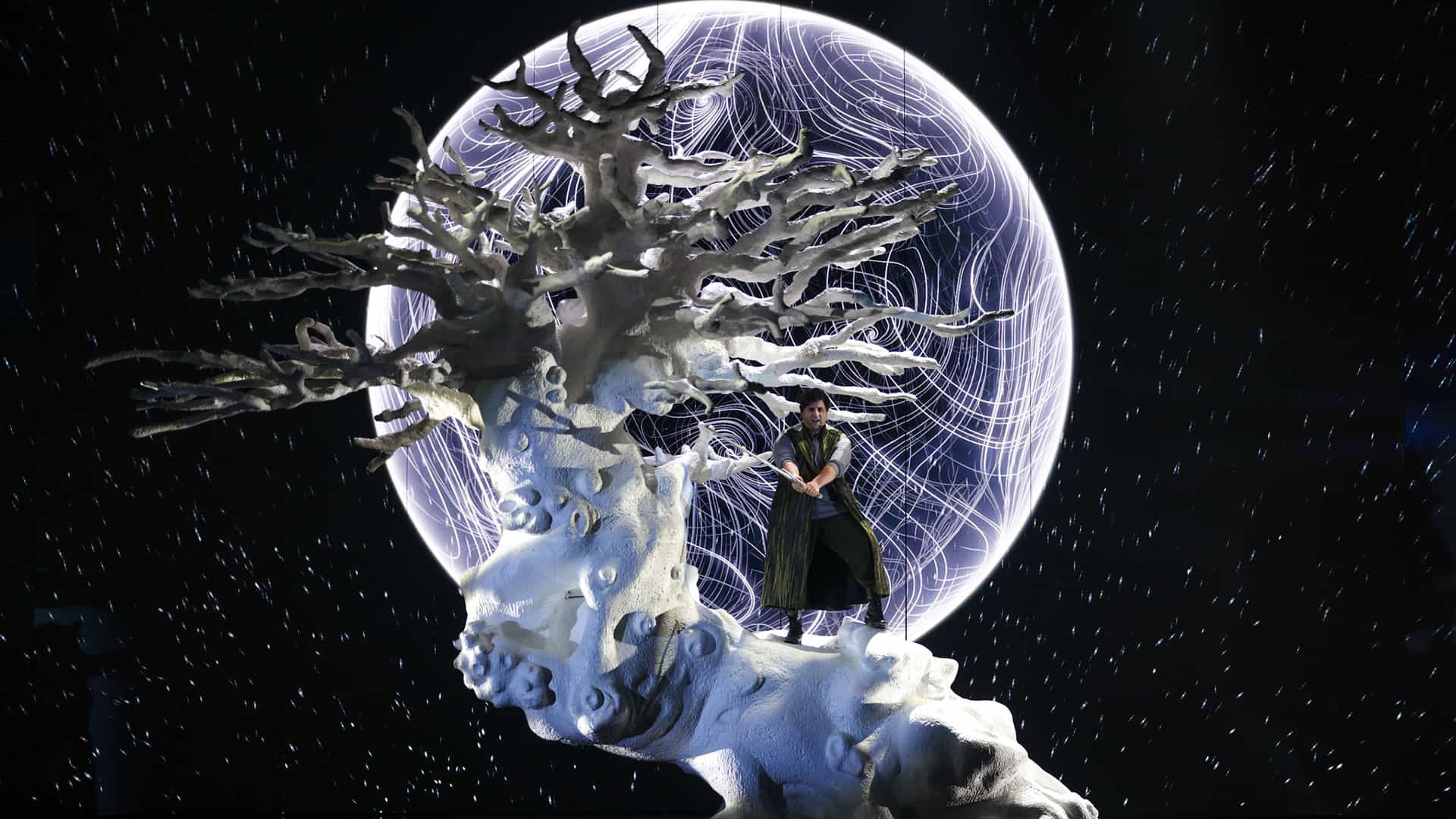 In a clear echo of the World Ash-Tree which withered and died after Wotan made a spear out of one of its branches and inscribed laws upon it, the tree in the centre of the stage looks withered and ancient beyond belief. A sword buried in its trunk is plainly visible, long before we know its purpose (though of course we are all familiar with the fact that if there is a gun on the wall in the first scene of a film it will certainly be used before the end). Shi-Zheng played with the idea of foreshadowing in the opening scene on Das Rheingold too, where the gold nugget at the bottom of the Rhine was also plainly visible from the start, long before the music talks about it. Although this sort of foreshadowing is not inconsistent with Wagner’s musical practice – we hear Siegfried’s motif in the last scene of Rheingold long before we know it refers to Siegfried – I find that to foreshadow the moment when the gold, or the sword, reveal themselves (to Alberich, and to Siegmund) cannot but detract from the element of surprise which is integral to theatrical effect. Both these moments are marked by Wagner in the score, who asks for shafts of light to illuminate the gold, and the sword.