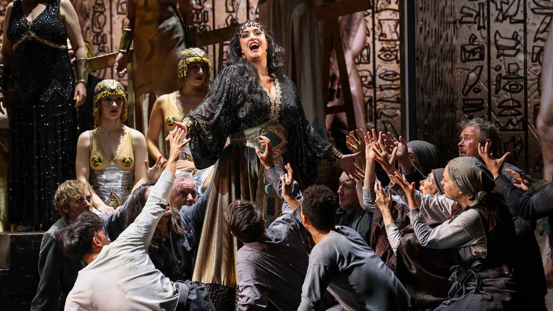 Acclaimed Italian Director Davide Livermore takes the audience on a visually, sumptuous journey, with extravagant costuming, with ten towering LED screens contributing symbolic imagery, grandiose themes, naked male and female torsos and coastal, wooded and desert landscapes. The richly conceived costumes designed by Gianluca Falaschi were shiny, intricate, glam and self-consciously cheeky but the Egyptian King wearing a silver helmet and a breastplate looked discordantly Roman.