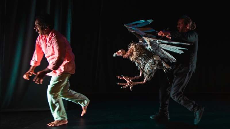 The only other performer is puppeteer/puppet maker, Jon Coddington, who dispels any previous prejudices against vultures with his humane creation of an enormous, very beautiful raptor puppet. Through Coddington’s masterful puppetry, the vulture is a glorious combination of spirituality, solemnity and humour.