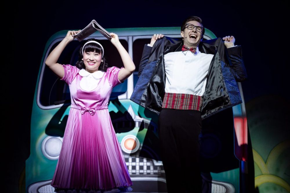 The set design opens with bubblegum style illustrations. So very stylised and full of colour with an element of perfection. It took me a moment, but only a short one, to be pulled into this world created by Hugh Durrant. The set combined with the lighting design by Nick Richings were supremely extravagant and took the production to a whole new level. The final scene where you watch the whole story take off in an alien spaceship was crafted brilliantly.