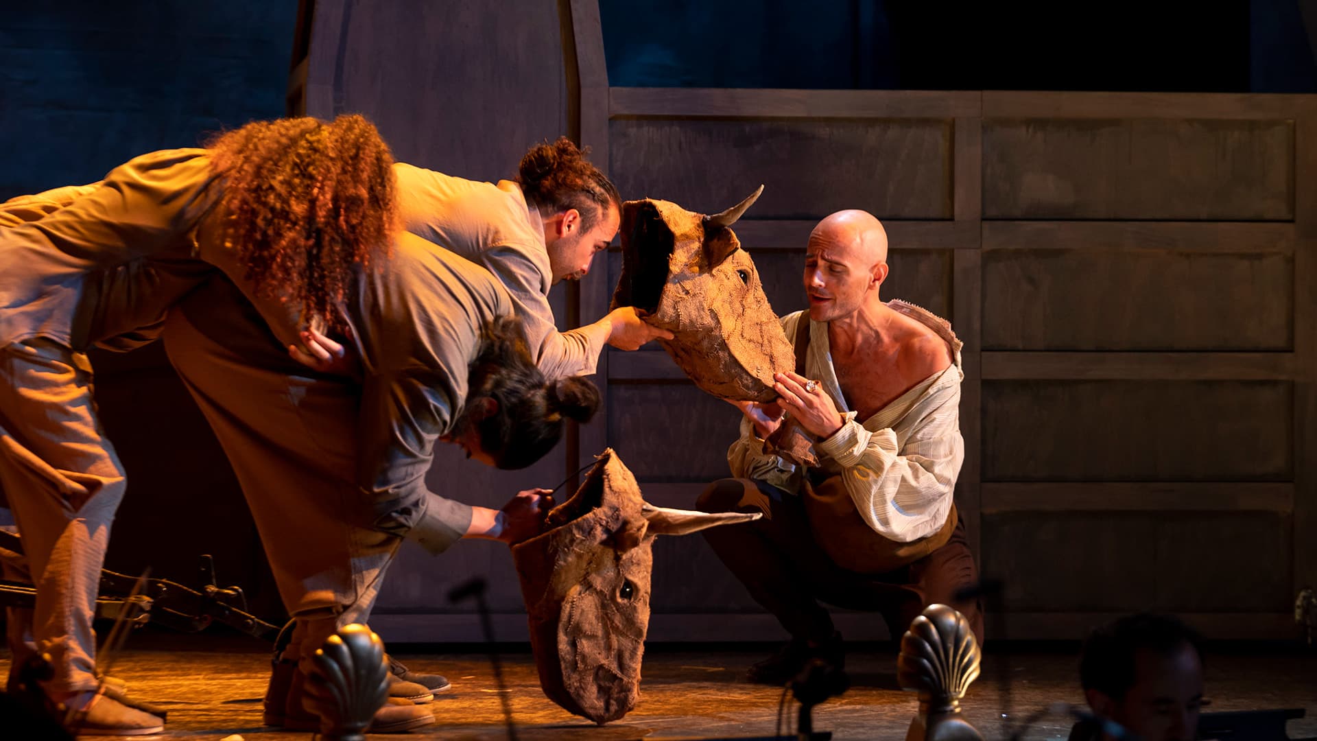 Melanie Lietz’ costuming was also particularly to my taste. But what made the theatrical side of this production really arresting was the work of the movement designer, Shannon Burns. She has designed movement in a few of Pinchgut’s recent productions, but here in addition she produced something worthy of Brisbane’s wonderful theatre company, Dead Puppets Society. In the first act she had the four supporting actors use “puppets” (models of the animals’ heads) to embody the oxen that the farmer Giustino uses to plough with, the bear that Giustino rescues Eufemia from, the sea monster that threatens Arianna on her rock, and most beautiful of all, an elephant.