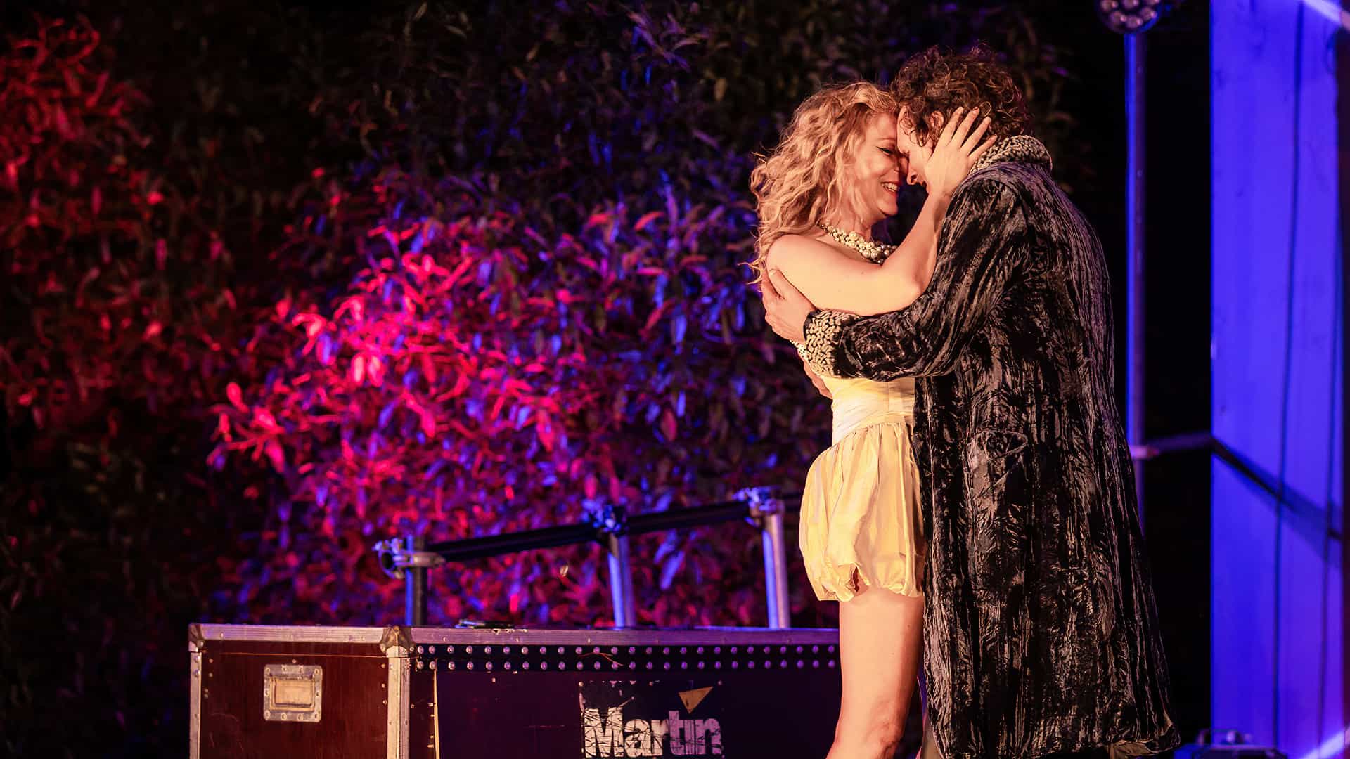 But the production is not about stars. It is a feat of teamwork, from the two pairs of lovers to the backstage crew. It shows in the stage business, the perfect props (a large, wheeled road case is the perfect hidey-hole for spying on lovers, not to mention the collapsible drinks bar) and the comic timing.