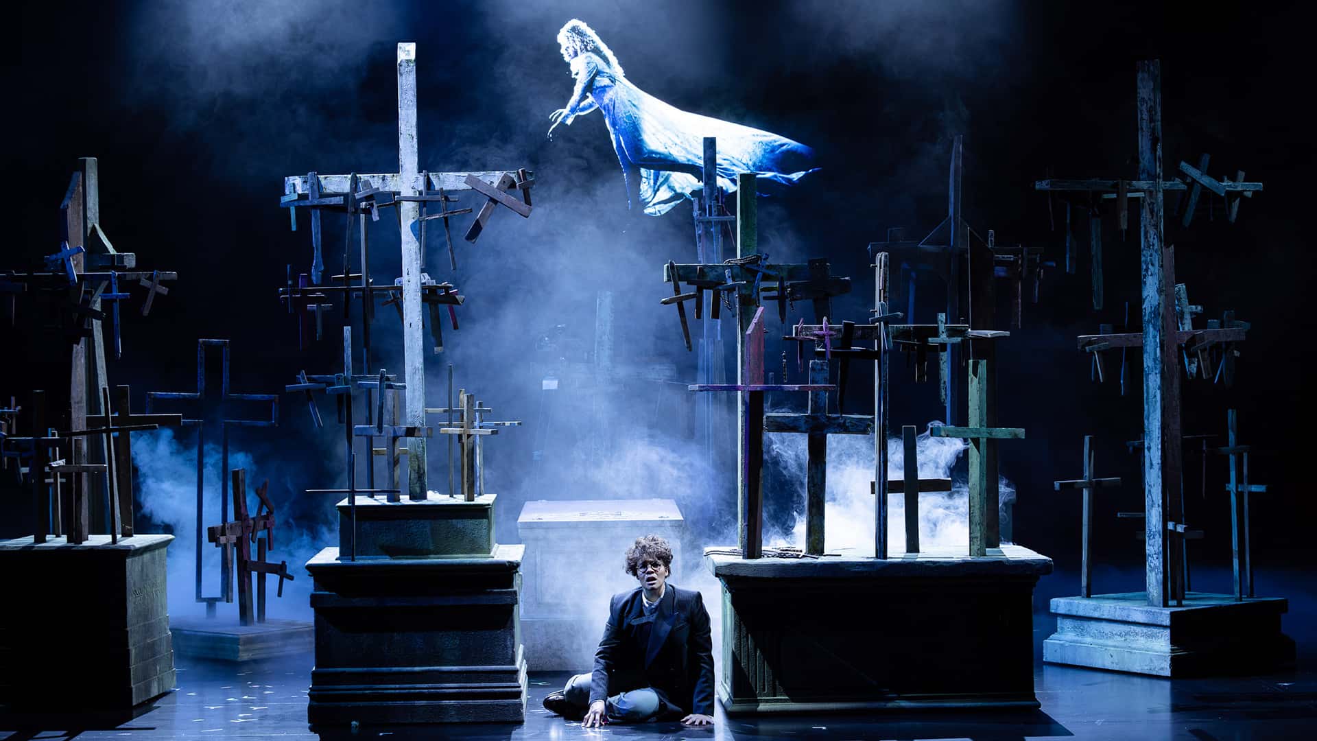 Set design evokes emblematic tropes of coaches, castles, crypts and crucifixes while the music score plays with Prokofiev and pulse beats.