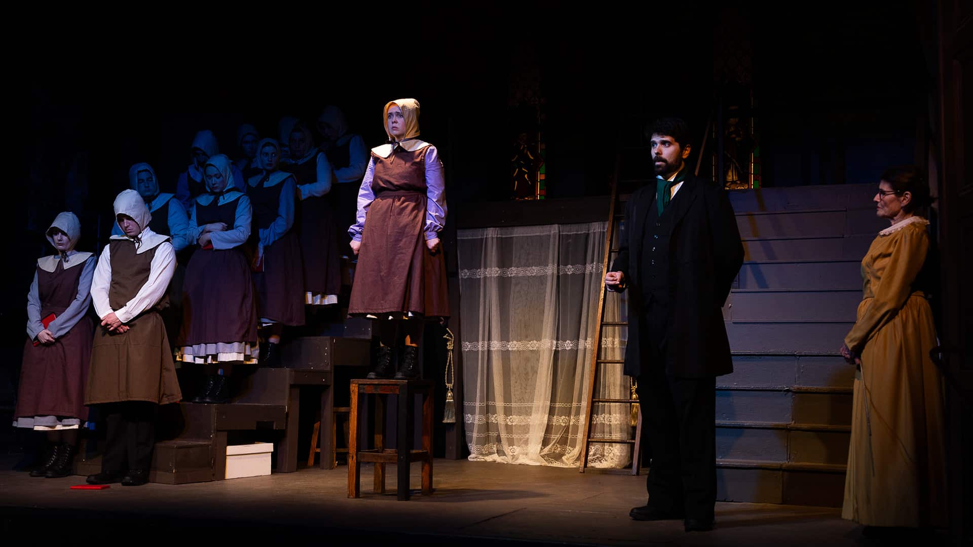 Every inch of the space, it seems, is utilised to create the ominously named Thornfield Hall, a gothic manor in which the drama plays out in Gothic manner, via trapdoors, turrets and ladders.